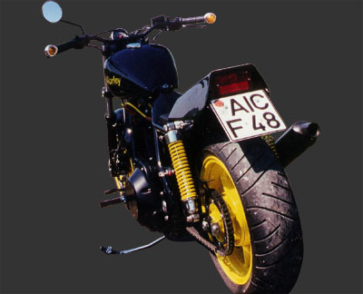 Erbauer: Modell: Baujahr: Neuaufbau: Motor: Getriebe: Primär: Rahmen: Gabel: Bremsen: Räder: Bereifung: Auspuff: Tank: Heck: Lack: Body Work: